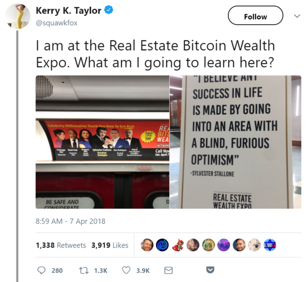 on the blockchain LOL @ the Real Estate Bitcoin Wealth Expo. April 15, 2018 0 Comments Hilarious! Kerry Taylor live-tweeted from this supremely awful event. | learn more bitcoin Kerry Taylor real estate tweet Wealth Expo